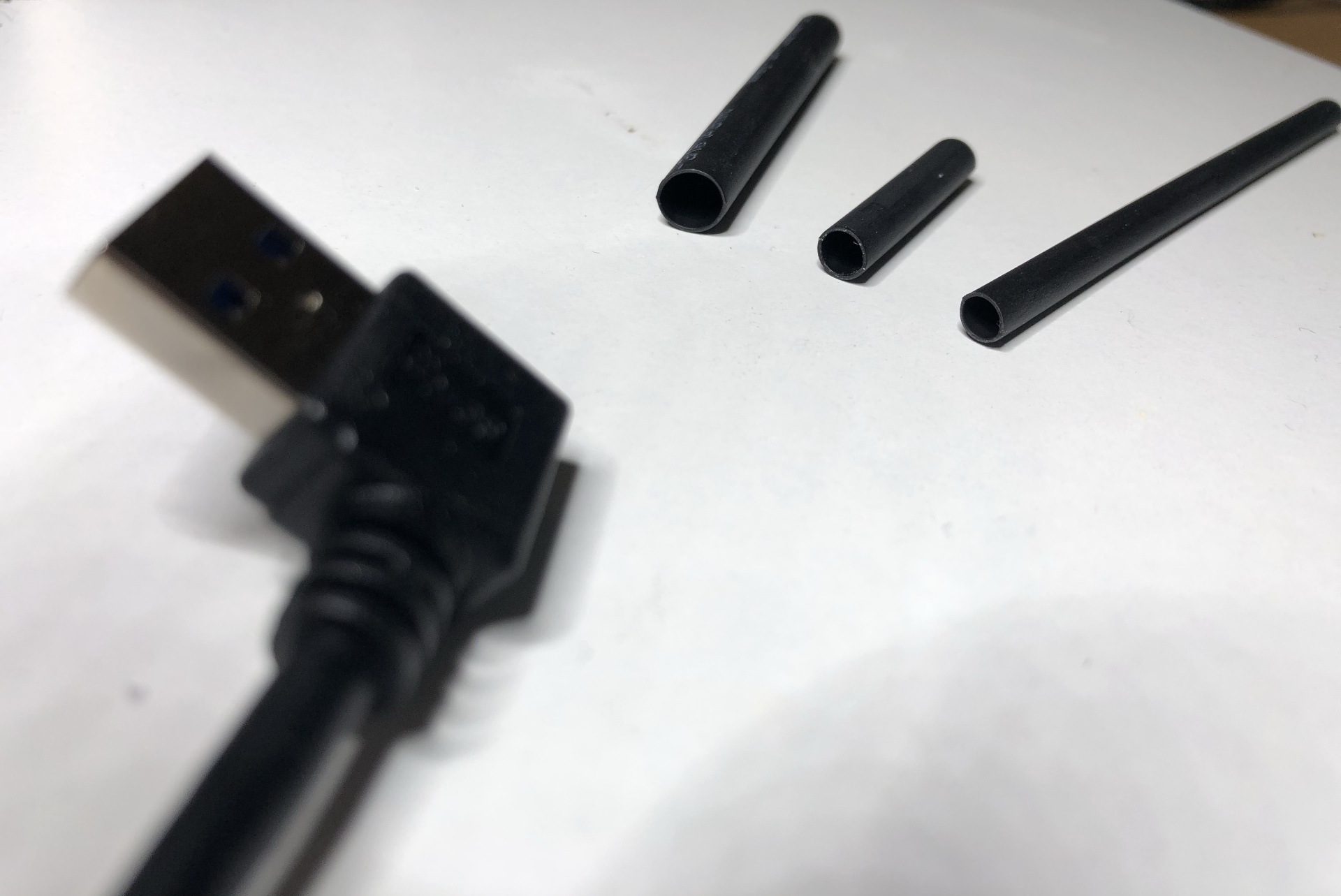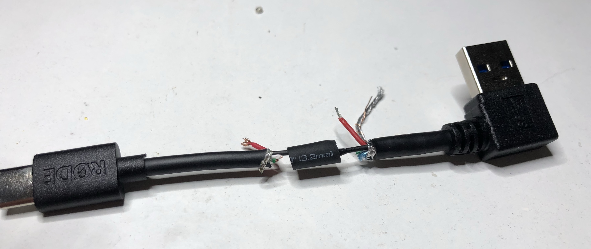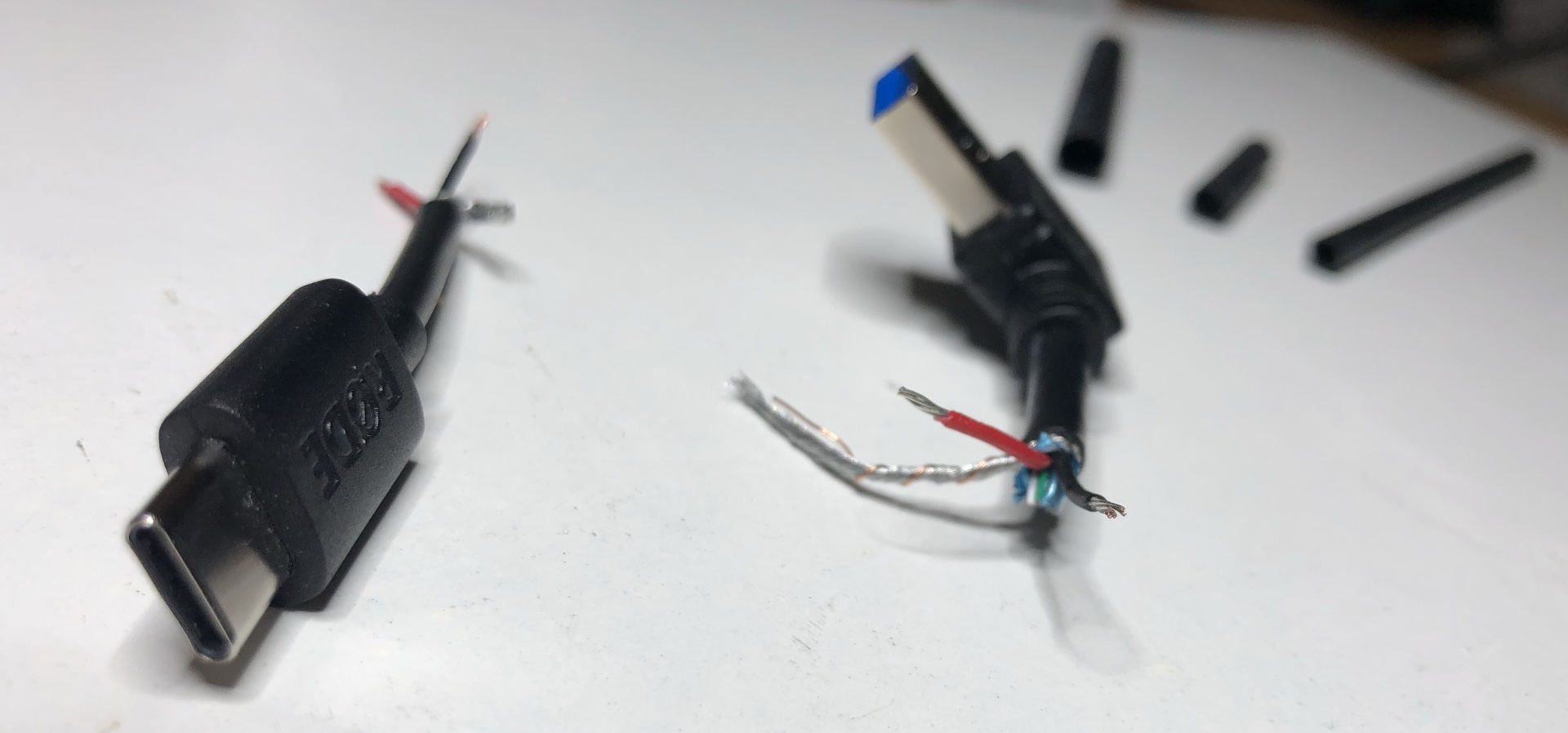 Man kann das aus zwei Kabeln aber auch einfach neu zusammen löten, wie ich es hier gemacht habe. Dafür benötigt man neben einem USB-A und USB-C Kabel auch etwas Schrumpfschlauch, sowie einen Heissluftfön. Ein Kerzenenanzünder tut es aber auch.